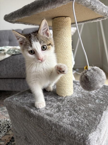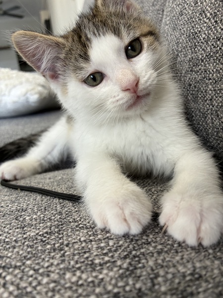 Coco is a gentle white and grey tabby girl with the most adorable little nose that's impossible to resist. She has a calm and loving personality, always ready to curl up for cuddles or quietly observe the world around her.