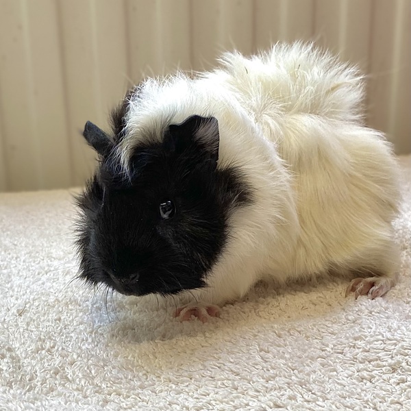Meet Giselle, a female Abyssinian Guinea Pig with a white and black coat.