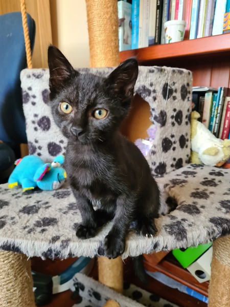 While she may be quiet, Chickity's purr is anything but - once she starts, she becomes a softly vibrating cloud of love. She's also a world‑class explorer in training, quick off the mark to investigate new corners of the house with careful curiosity.