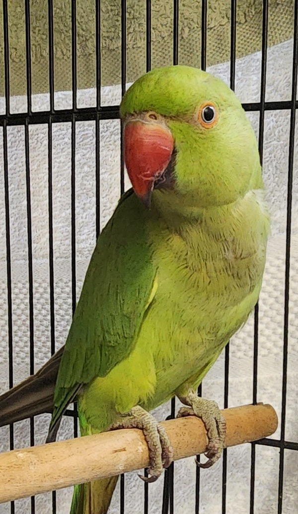 Zelená (Slovak for "Green", pronounced zeh‑leh‑NAH) is a beautiful Indian Ringneck who is very social and would love more handling and gentle socialisation. She will suit a patient adopter willing to build trust at her own pace.