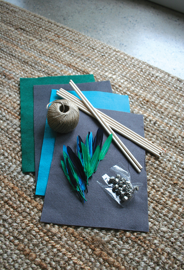 2. Thread two bells onto the end of a long piece of twine and knot the twine tightly around the quills of the bunch of feathers. Cut off the short end of the twine close to the knot.