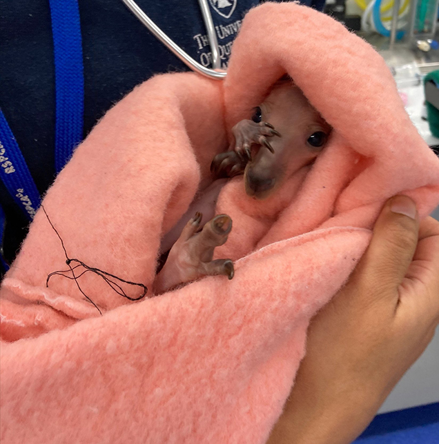 Recently, just as I was pulling out of my driveway to start my day, I found a lovely local who had stopped nearby to pouch check a deceased mother wallaby. She had only recently been hit by a car. I was on my way to work and stopped to help this caring member of the public. We noticed that the mum roo had a joey on board, and it was still very much alive. We bundled up the deceased mum, with bub still in the pouch, into my car and I headed off to the RSPCA.